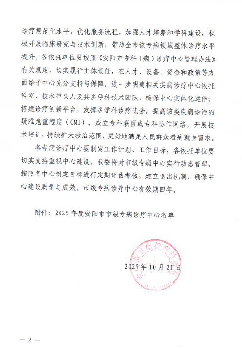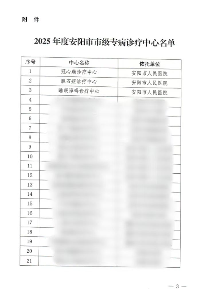近日,安阳市卫生健康委员会正式发布《关于公布2025年度安阳市市级专病诊疗中心名单的通知》,我院凭借雄厚的学科建设基础、精湛的医疗技术水平、完善的医疗服务体系以及良好的社会口碑,成功获批三大市级诊疗中心——冠心病诊疗中心、胆石症诊疗中心、睡眠障碍诊疗中心。